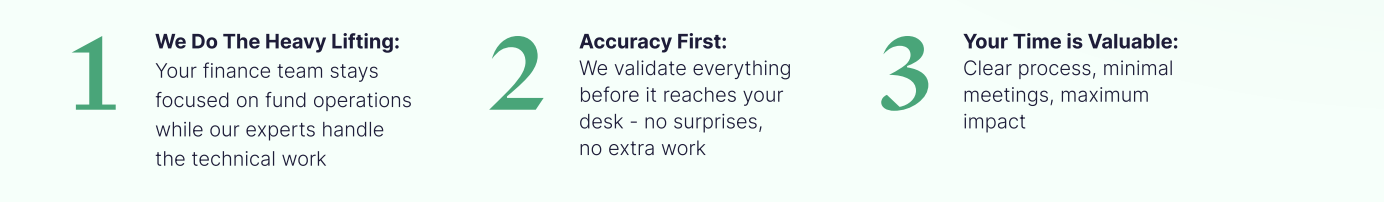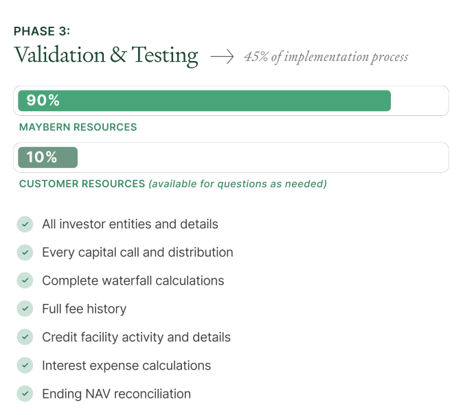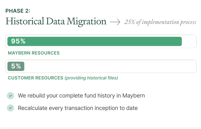 Maybern's white-glove implementation handles 75-95% of the work so your finance team stays focused on fund operations - not software rollouts.